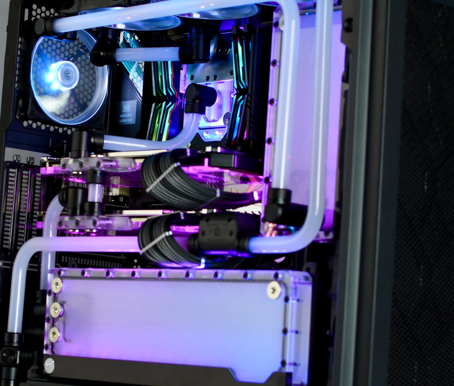 - Hardline tubing, crystal-clear coolant, distribution plates, GPU blocks, CPU blocks, perfect symmetry.
